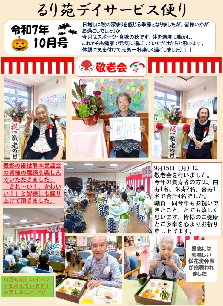 7月のデイサービスだよりができました。 2025.10.02 熊本の介護老人福祉施設・デイサービス「るり苑」 お知らせ るり苑のデイサービスだよりでは、ご利用者様の活動の様子、イベントの予定などをお知らせしてい ます。 下記のダウンロードリンク(R7年7月)をクリックしますと、PDF形式でご覧いただけます。 ぜひ一度ご覧ください。 R7年10月