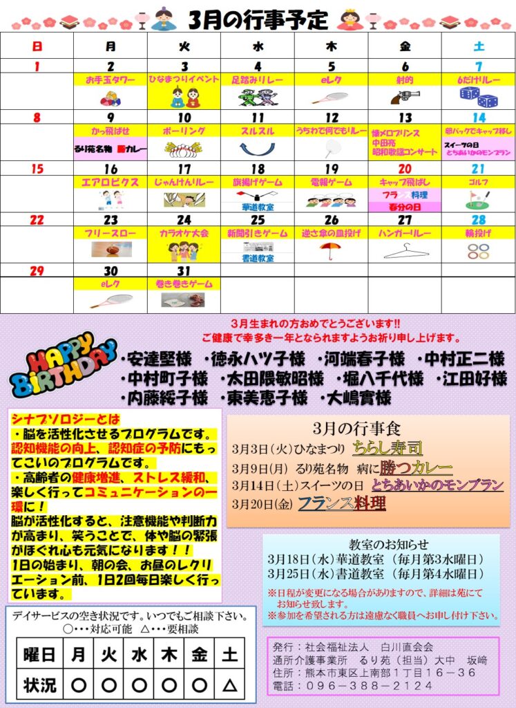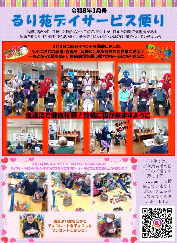 3月のデイサービス便りができました。 2026.02.28 熊本の介護老人福祉施設・デイサービス「るり苑」 お知らせ るり苑のデイサービスだよりでは、ご利用者様の活動の様子、イベントの予定などをお知らせしてい ます。 下記のダウンロードリンク(R8年3月)をクリックしますと、PDF形式でご覧いただけます。 ぜひ一度ご覧ください。 R8年3月